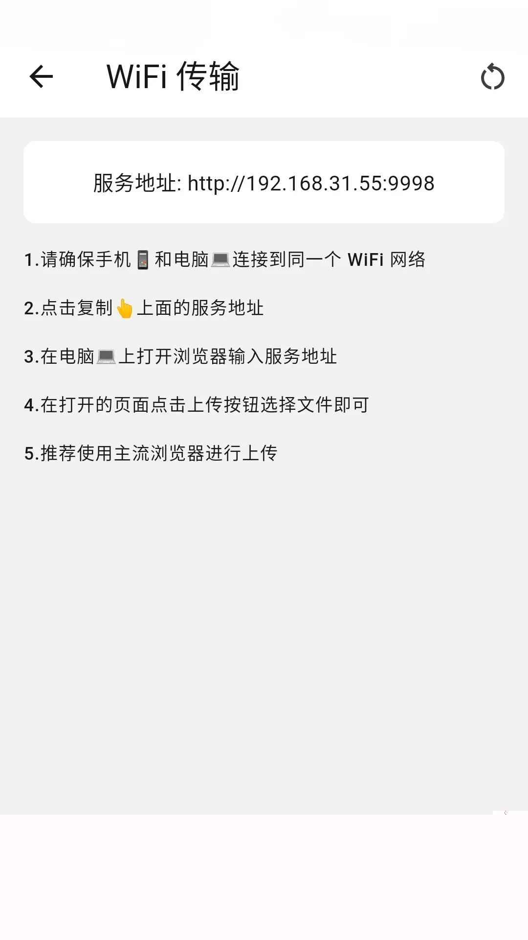 启动软件内的Wi-Fi传书功能,在电脑浏览器中输入显示的地址,即可通过网页界面上传文件。此方法无需安装额外客户端,传输速度取决于本地网络环境。
