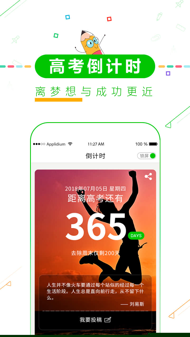 每日自动更新锁屏与桌面壁纸,直观显示距离高考的剩余天数,将时间压力转化为持续的视觉提醒与前进动力。