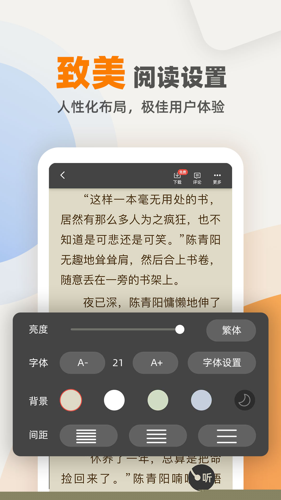 允许用户深度调整字体类型、大小、间距、背景色与亮度,支持日间/夜间模式一键切换,以适配不同环境下的视觉舒适度要求,缓解长时间阅读带来的眼部疲劳。
