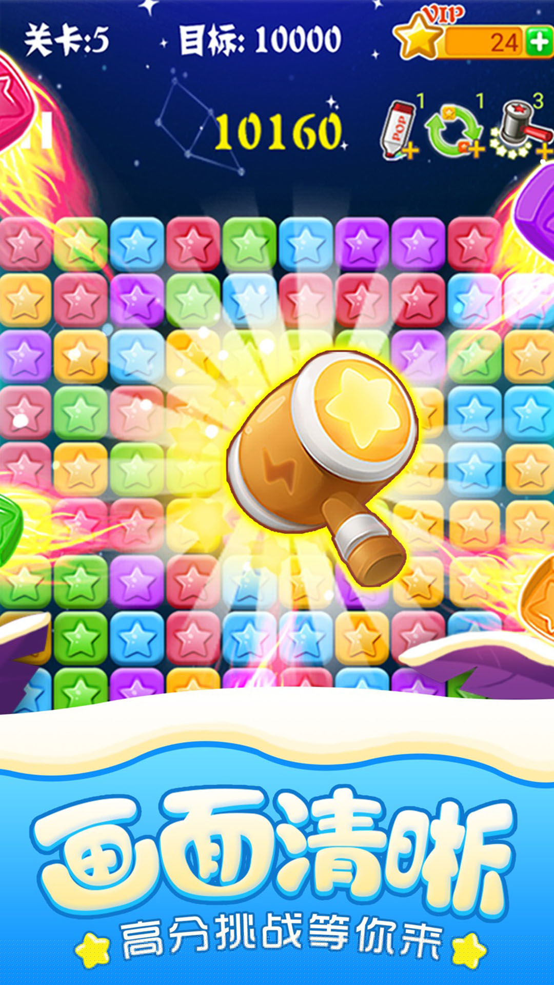 核心玩法围绕消除展开。屏幕中布满不同颜色的星星方块,的主要目标是点击选中两个或以上相邻的同色方块群组,使其消失。每一次消除,上方的方块会因重力下落,可能形成新的同色连接,从而引发连锁反应。单次消除的方块数量至关重要,消除越多,单个方块的基础得分加成越高,这是获取高分、达成关卡目标的核心。