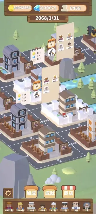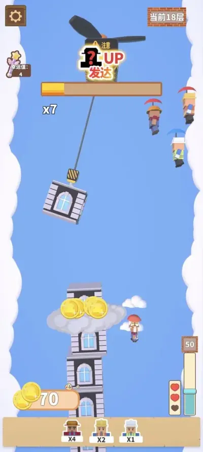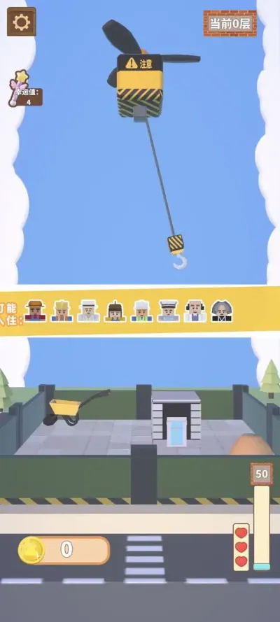 核心目标在于操控塔吊,将不断下落的各种形状楼层平稳地堆叠起来,构筑一座直入云霄的摩天大厦。整个过程通过触屏点击完成:长按屏幕控制吊钩移动至目标位置,松开手指即可释放楼块。成功的堆叠会使建筑增高,并带动下方城镇逐步解锁新的区域与居民,形成直观的正向反馈循环。而失败的堆叠则可能导致建筑重心偏移、剧烈摇晃乃至整体坍塌,宣告本次建造尝试结束。