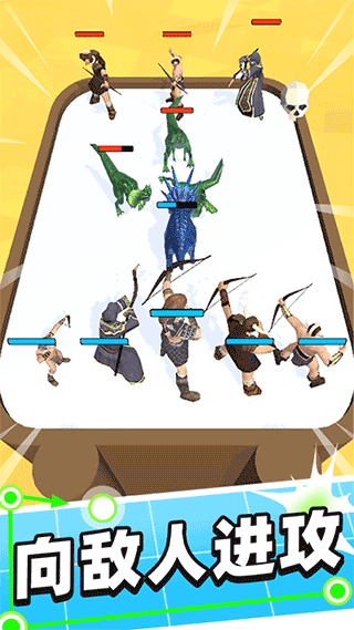 对局的核心目标是摧毁敌方基地。开局后,战场中线会持续刷新敌我基础单位。需利用初始金币,从屏幕下方的购买区招募初级士兵或恐龙,并将其拖动至己方半场的理想位置。单位的自动前进与攻击构成了基础战线,合理布阵是稳住阵脚的第一步。